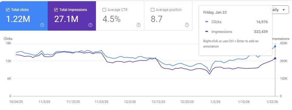 أكثر من 1.22 مليون نقرة و27.1 مليون ظهور في نتائج بحث جوجل بمتوسط ترتيب 8.7 — نتائج تحققت من خلال خطة SEO متكاملة تقنيًا.