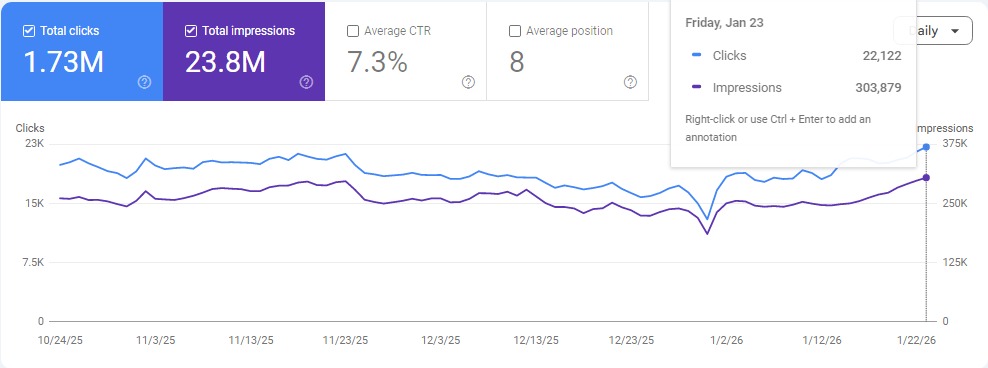 الموقع حقق أكثر من 1.73 مليون نقرة و23.8 مليون ظهور على جوجل بشكل مجاني بالكامل. والجراف بيوضح إن الأرقام في نمو مستمر وثابت، وده اللي بيميز السيو.