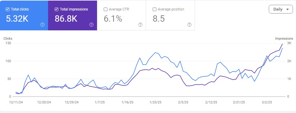 مثال حقيقي من Google Search Console يوضح نمو الزيارات العضوية لموقع طبي، نتيجة تطبيق استراتيجيات السيو من A plan المتوافقة مع معايير المحتوى الطبي وتجربة المستخدم.