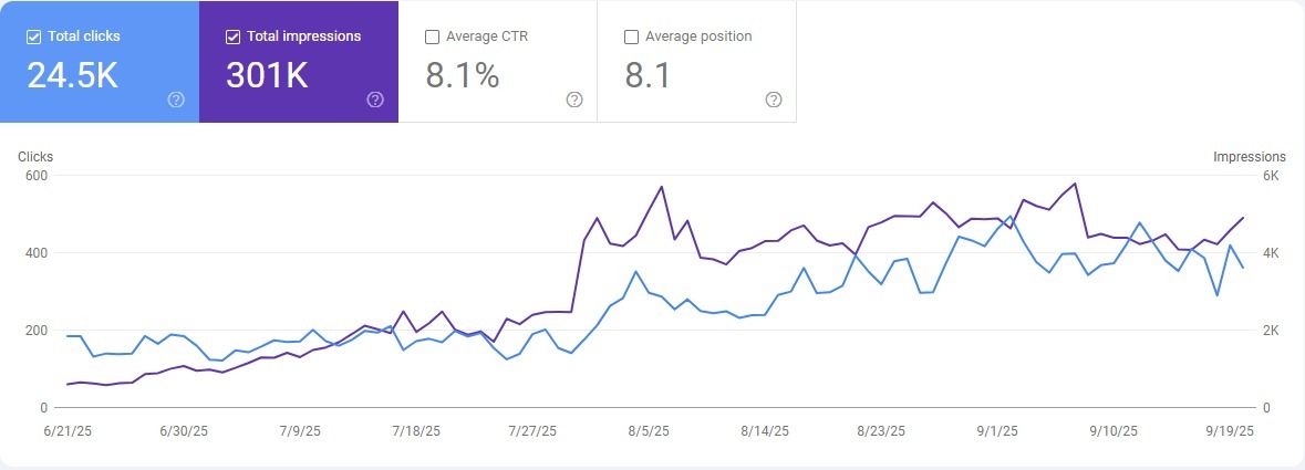 - إجمالي مرات الظهور في نتائج البحث 301 ألف مرة، وإجمالي النقرات 24.5 ألف نقرة، هذا يعني أن الموقع حصل على عدد زيارات فعلية خلال هذه الفترة.